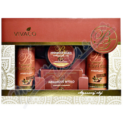 Dárkové balení Arganový olej obsahuje sprchový gel 200 ml, tělový olej 200 ml, tuhé mýdlo 100 g a arganové máslo 100 ml.