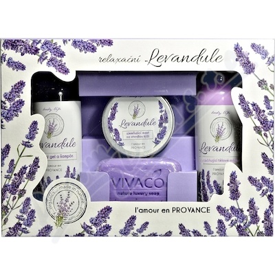 Dárková kazeta obsahuje: levandulový sprchový gel a šampon 250ml, levandulové tělové mléko 250ml, levandulovou zjemňující mast 100ml a levandulové tuhé mýdlo 100g.