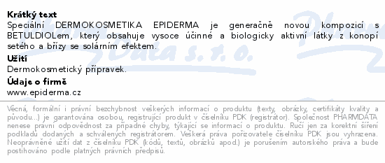 Speciální DERMOKOSMETIKA EPIDERMA je generačně novou kompozicí s BETULDIOLem, který obsahuje vysoce účinné a biologicky aktivní látky z konopí setého a břízy se solárním efektem.