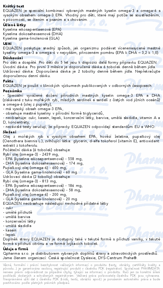 EQUAZEN je speciální kombinací vybraných mastných kyselin omega-3 a omega-6 s vysokým obsahem omega-3 EPA. Vhodný pro děti, které mají potíže se soustředěním, s pozorností, se čtením a psaním a s chováním.