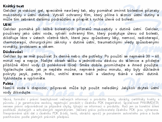 Gelclair je viskózní gel, speciálně navržený tak, aby pomáhal zmírnit bolestivé příznaky mukositidy v ústní dutině. Vytváří ochranný film, který přilne k sliznici ústní dutiny a může tím zabránit dalšímu podráždění a přispět k rychlé úlevě od bolesti.