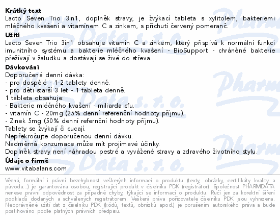Lacto Seven Trio 3in1, doplněk stravy, je žvýkací tableta s xylitolem, bakteriemi mléčného kvašení a vitamínem C a zinkem, s příchutí červený pomeranč.