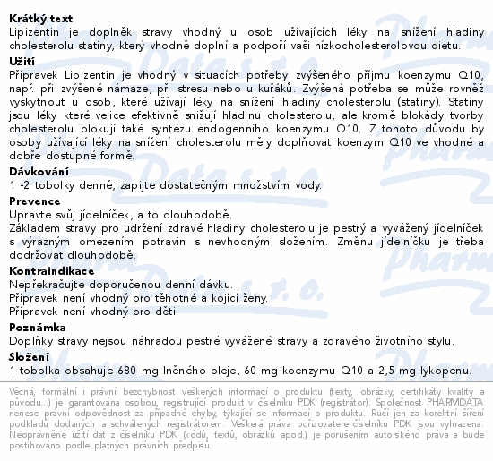 Lipizentin je doplněk stravy vhodný u osob užívajících léky na snížení hladiny cholesterolu statiny, který vhodně doplní a podpoří vaši nízkocholesterolovou dietu.