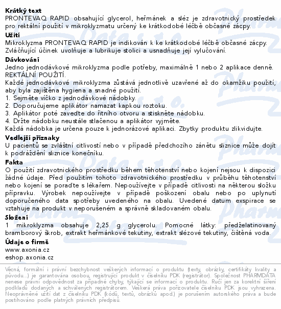 PRONTEVAQ RAPID obsahující glycerol, heřmánek a sléz je zdravotnický prostředek pro rektální použití v mikroklyzmatu určený ke krátkodobé léčbě občasné zácpy.