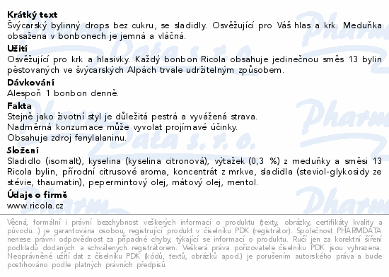 Švýcarský bylinný drops bez cukru, se sladidly. Osvěžující pro Váš hlas a krk. Meduňka obsažena v bonbonech je jemná a vláčná.