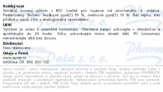 Smíšený ovocný příkrm v BIO kvalitě pro kojence od ukončeného 4. měsíce. Pasterovaný. Složení: hruškové pyré(1) 90 %, malinové pyré(1) 10 %. Bez lepku, bez přídavku cukrů. (1)= z ekologického zemědělství.